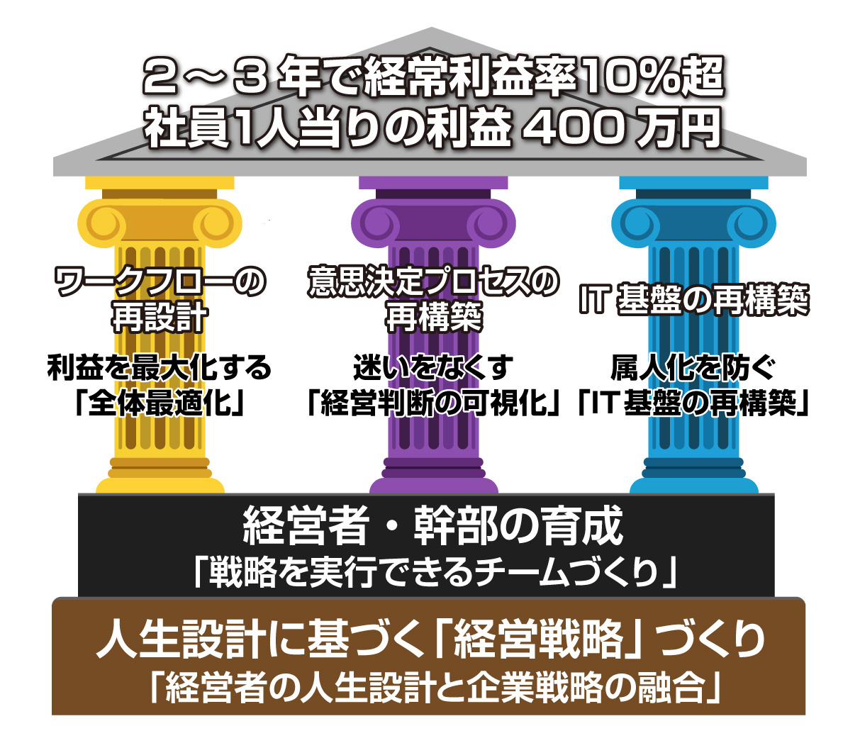 多くの企業が「売上」を追う一方で、「利益」が残らない構造に悩まされています。当社のコンサルティングは、単なるアドバイスに留まりません。戦略・人・仕組みの3層を統合し、「経常利益率10%超」「社員1人当たりの利益400万円」という具体的な成果を導き出すための、確かなプロセスを提供します。
